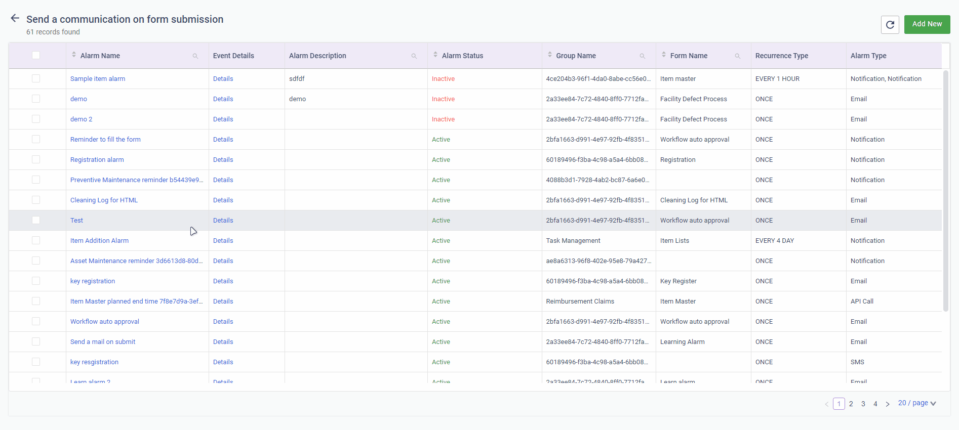 2\.   In the **Send a communication on form submission** card, click **Continue.** The list of existing alarms is displayed.