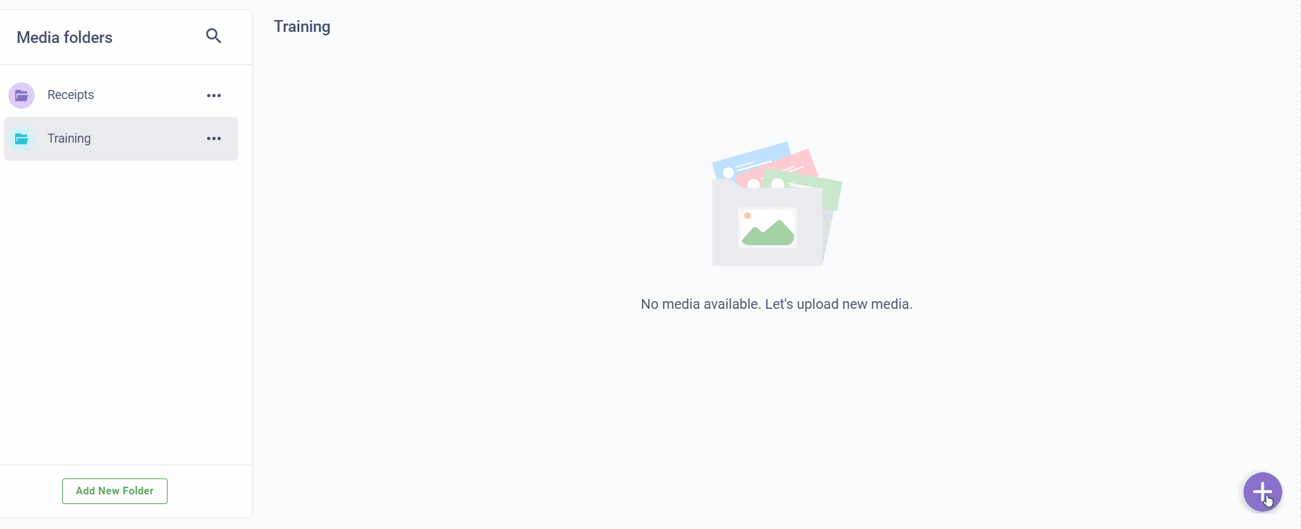 2\.    To add media files, click on the folder in which you want to add a media file and, then in the right pane, click <img src="https://4216568905-files.gitbook.io/~/files/v0/b/gitbook-x-prod.appspot.com/o/spaces%2F-Mc6E3BSGr4i8kVdH38k%2Fuploads%2FmPTV7TslOKTD8CZAVCs3%2Fimage.png?alt=media&#x26;token=811a3603-cc52-4b10-945d-e336e56a68bc" alt="" data-size="line">. The two media upload options are displayed.