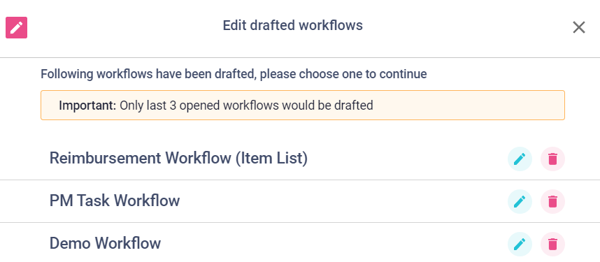 Note: Only the last three opened workflows are drafted. So, we will not see any workflows that were accessed prior to the last 3 opened workflows in the list of drafted workflows.
